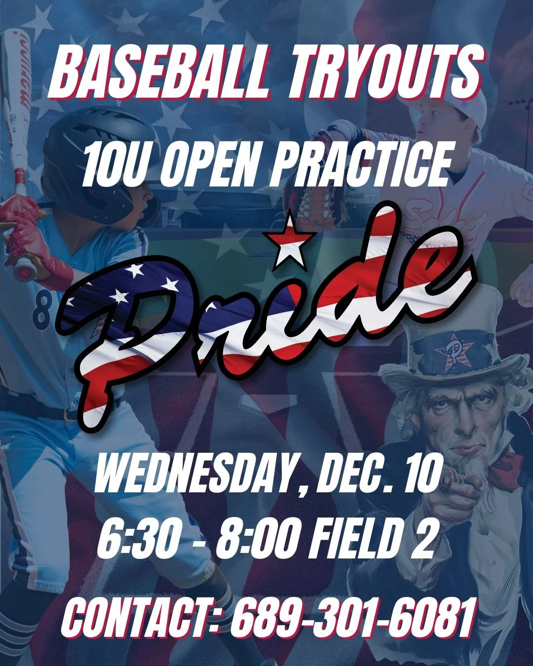 Poster advertising American baseball tryouts for ages 8-12 years old, scheduled for November 22 at The Dugout, with a background featuring children playing baseball and patriotic symbols.
